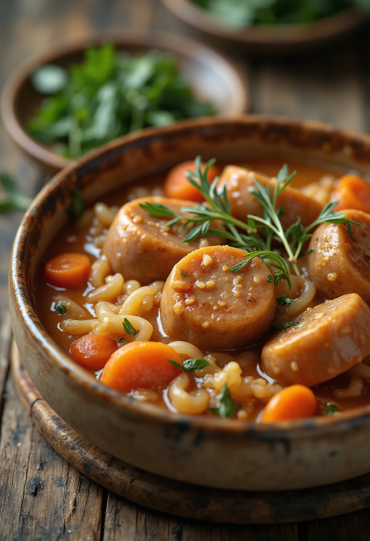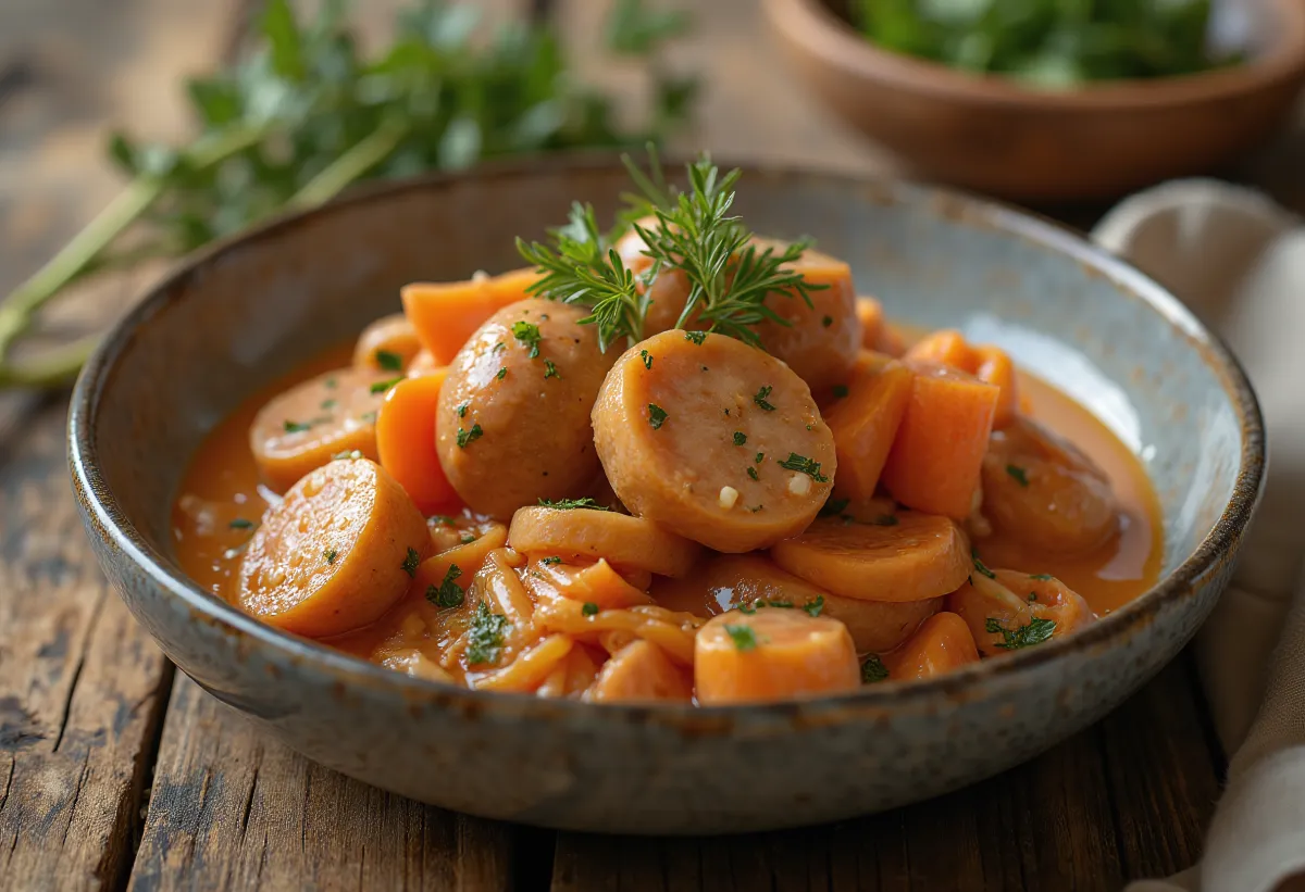 Falukorv er svenskenes nasjonalpølse, med en historie som går tilbake til 1500-tallets kobbergruvedrift. Dette er en mildt krydret, kokt og røkt pølse som finnes i ethvert svensk kjøleskap. I denne rustikke gryteretten kompletteres pølsens fedme av gulrotens sødme og løkens aroma, og skaper en enkel, men mettende hverdagsmiddag.