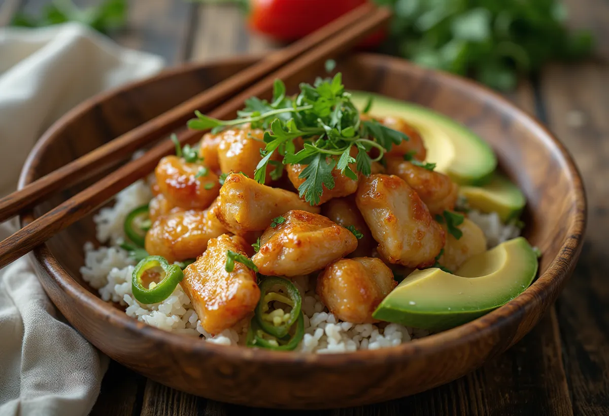 Selv om Poké (hawaiisk for 'å skjære i biter') opprinnelig betydde rå fisk, tilpasser denne moderne bollen konseptet: munnfullstore biter av velsmakende proteiner (her kylling), friske, sprø grønnsaker og ris i én bolle. Opplevelsen baserer seg på kontraster: varm ris vs. kald topping, myk avokado vs. sprø agurk, salt soyasaus vs. søtt kjøtt.